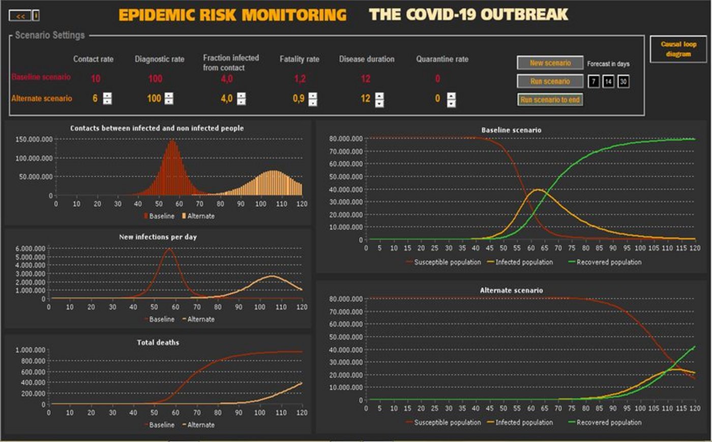 In SD-Modellen lassen ich einzelne Parameterwerte verändern und deren Auswirkungen simulieren. Gelingt es beispielsweise die Kontaktrate zu senken (etwa über den Verzicht von Großveranstaltungen) so wird im Modell deutlich, dass sich die Infektion wesentlich langsamer ausbreitet, es eine geringere Anzahl an infizierten Personen gibt und letztendlich weniger Todesfälle zu beklagen sind.