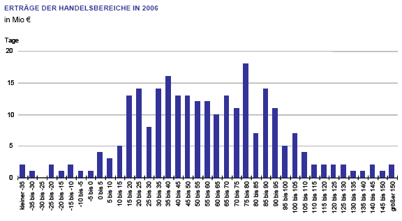 Das folgende Balkendiagramm zeigt die Verteilung der tatsächlichen täglichen Erträge der Handelsbereiche im Jahr 2006. Die Balkenhöhe gibt die Anzahl der Handelstage an, an denen der auf der horizontalen Achse in Mio € angegebene Handelsertrag erzielt wurde.