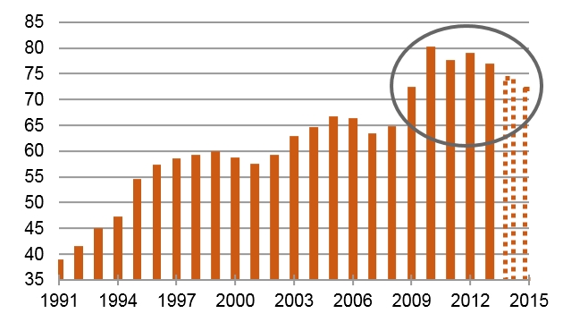 Dass die Schuldenquote von 2010 bis 2015 trotzdem zurückgeht, liegt an zwei Dingen. Zum einen hat sich das Bruttoinlandsprodukt um fast EUR 400 Mrd. erhöht. Damit wird der Nenner größer und die Schuldenquote verringert sich. Das war der wichtigste Effekt. Selbst wenn der Staat also keine Kredite zurückzahlt, geht die Schuldenquote allein durch das Wirtschaftswachstum zurück.