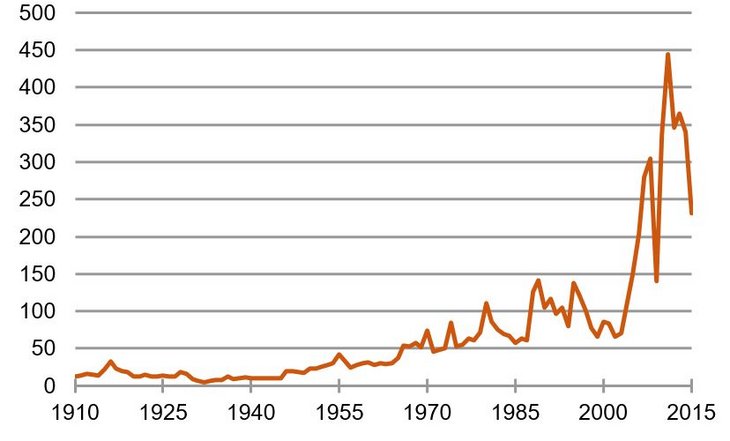 Ich möchte dieses Mantra in Frage stellen. Ich glaube, dass die Community hier einem Irrtum aufsitzt. Ich habe mir dazu einmal die historische Entwicklung der Rohstoffpreise in den letzten hundert Jahren angeschaut. In der Grafik sind als Beispiel die Kupferpreise seit 1910 dargestellt. Über 90 Jahre lang stiegen sie bei nur relativ kleinen Schwankungen mit einer Rate von etwas mehr als zwei Prozent p. a. Nach der Jahrtausendwende sind sie dann förmlich explodiert. Sie erhöhten sich um mehr als das Fünffache. Jetzt kommen sie wieder zurück, haben aber immer noch nicht das Niveau des Jahres 2000 erreicht.
