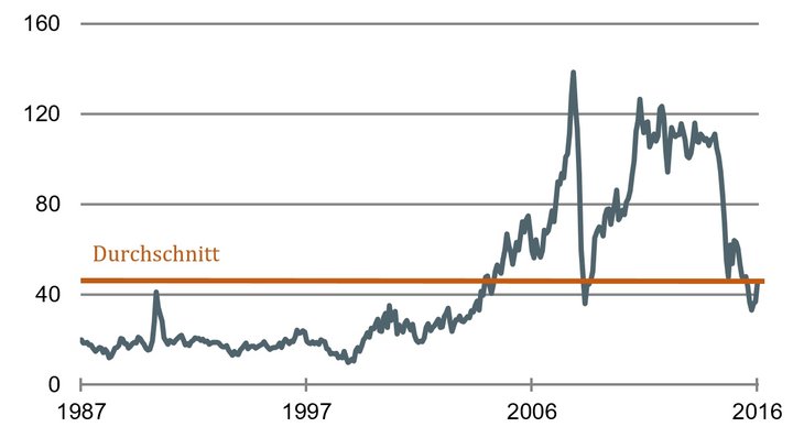 Wichtiger für die Wirkungen des Ölpreises auf die Kapitalmärkte ist etwas anderes. Bei dem gegenwärtigen Preis ist Öl nicht mehr wirklich billig. 50 Dollar sind etwas mehr als der Durchschnitt der letzten dreißig Jahre (siehe Grafik).