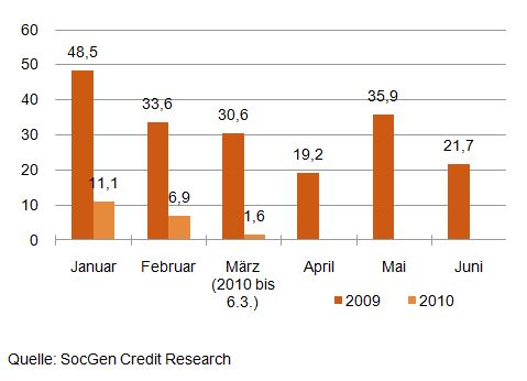 Die Neuemissionsaktivität wird 2010 ähnlich hoch sein wie 2009, wofür die Fälligkeitsstruktur im Banken- und Unternehmenssektor sowie die steigende Staatsverschuldung (die refinanziert werden muss) sprechen.
