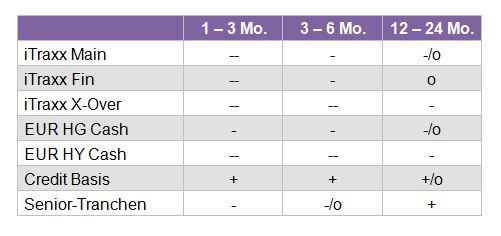 Angesichts der engeren Spread-Niveaus muss also wieder über potenzielle Absicherungsstrategien nachgedacht werden, wobei v. a. die Steilheit der Kreditkurven im europäischen Investment Grade-Bereich zwischen drei und fünf Jahren zu Flattening-Positionen einlädt. Eine solche Positionierung kann spread- und/oder ausfallrisikoneutral eingegangen werden und performt i. d. R. genau in Spread-Ausweitungs-Szenarien.