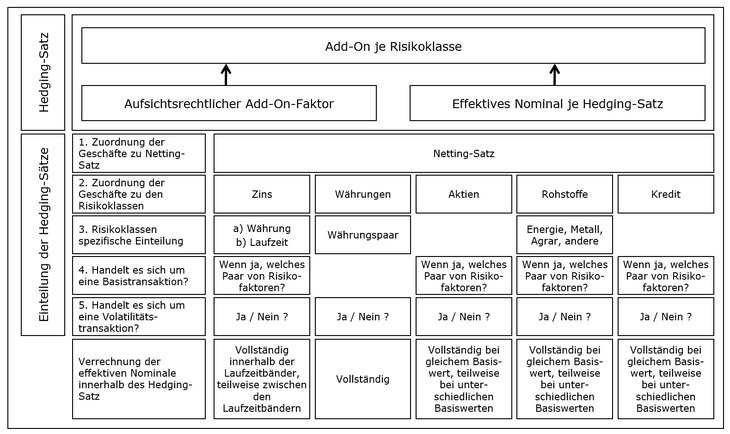 Bank B als Nicht-ASA-Bank hat kein Wahlrecht wie die ASA-Banken, sondern muss den nachfolgend beschriebenen Ansatz benutzen. Das gilt auch für Nicht-ASA-Banken, welche die vereinfachte SACCR nutzen dürfen. Generell gilt, dass die Zuordnung der Derivate zu Hedgingsätzen in der vereinfachten SA-CCR identisch zur normalen SA-CCR ist.