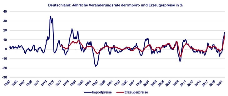 Ein Blick auf "vorlaufende" Preisdaten, wie Erzeugerpreise oder Importpreise schürt ebenfalls die Befürchtung, dass sich die Inflation strukturell verfestigt. Mit einem Anstieg von 12,0 % lagen die Produzentenpreise in Deutschland zuletzt auf dem höchsten Niveau seit 1974. Die Importpreise verzeichneten mit +15,0 % den höchsten Zuwachs seit 1981. Es steht zu befürchten, dass sich die stark erhöhten Rohstoff-, Erzeuger-, Großhandels- und Produzentenpreise mit einer gewissen Zeitverzögerung in die Verbraucherpreise durchfressen werden und somit über die kommenden Monate Aufwärtsdruck auf die Inflationsraten ausüben. Gerade in Deutschland scheint der Hochpunkt der anziehenden Teuerung noch nicht erreicht.