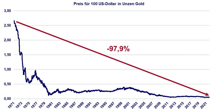 Wie wenig das nach 1971 zirkulierende "Fiat Money” dem Anspruch an ein wertiges Tauschmittel gerecht werden konnte, zeigt der Verfall seines inneren Wertes und damit seiner realen Kaufkraft: Bis 1971 war eine Feinunze Gold bei 35 US-Dollar fixiert. Heute kostet eine Feinunze Gold 1.756 Dollar; sodass sich mit 35 US-Dollar gerade noch 0,6 Gramm statt 31,1 (= 1 Unze) Gold erwerben lassen. Ein Kaufkraftverlust von 98%! Dieser Effekt ist nicht allein im US-Dollar präsent, sondern in allen nach 1971 zur ungedeckten Papierwährung gewordenen Währungen.