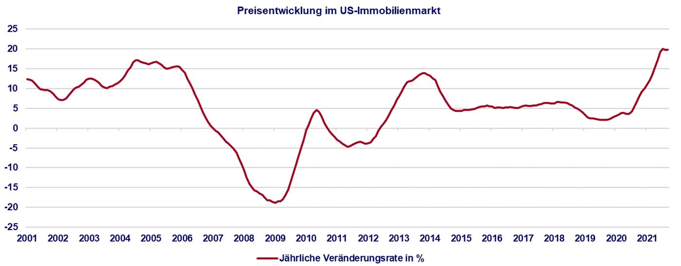 Gleichzeitig erreichen die US-Immobilienpreise nie zuvor gesehene Höhen. Der breite Case-Shiller-Index kletterte zuletzt mit Preissteigerungen von über 18 % auf neue Allzeithochs. Mit einem Zeitverzug von ein bis zwei Jahren werden sich diese Teuerungsraten auch in der als "Owner’s Equivalent Rent" (OER) bezeichneten und innerhalb der US-Verbraucherpreise hoch gewichteten Komponente wiederfinden und so den Inflationsdruck weiter anfachen.