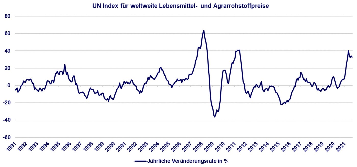 Eine besonders bedenkliche Entwicklung ist aktuell, zum Teil auch als Derivat steigender Rohstoffpreise, bei den Lebensmittelpreisen zu beobachten. In den Niederlanden wird beispielsweise der Anbau von Obst und Gemüse in Gewächshäusern drastisch zurückgefahren, weil die Beheizung der Anlagen mit den stark gestiegenen Gaspreisen nicht mehr wirtschaftlich zu organisieren ist. Die resultierende Angebotsverknappung zeigt sich bereits in den Preisen der Supermarktregale.