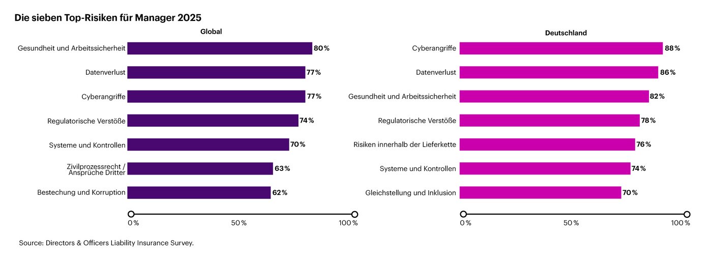In Deutschland zeigt sich ein differenziertes Risikoprofil. Für 88 Prozent der deutschen Befragten zählen Cyberattacken zu den größten Risiken – gefolgt von Datenverlusten (86 Prozent), Gesundheit & Arbeitssicherheit (82 Prozent), regulatorischen Verstößen und Defiziten bei Systemen und Kontrollen. Auch Themen wie Gleichstellung und Inklusion sowie Haftungsfragen im Kontext der Lieferkette werden zunehmend relevant.