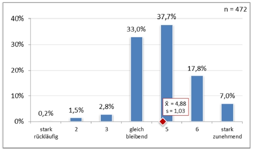 Die Verknüpfung von Marke und Reputation schafft eine besondere Form symbiotischer Abhängigkeit. Das fragile und facettenreiche Gebilde Reputation kann innerhalb weniger Augenblicke zerstört werden. Daher muss es das Ziel jeden Unternehmens sein, Reputationsbedrohungen rechtzeitig zu erkennen und die Reputation durch Prävention langfristig zu erhalten. Denn die "Dominorallye" beim Eintritt von Reputationsrisiken kann rasend schnell verlaufen. Dieser Aspekt gewinnt durch das in Abbildung 1 dargestellte Ergebnis an Bedeutung: Der Mittelwert von 4,88 und die Häufigkeitsverteilung der Antworten deuten darauf hin, dass Reputationsrisiken zukünftig an Bedeutung gewinnen werden. Mehr als die Hälfte aller Teilnehmer (62,5 %, Antworten 5 bis 7) gaben an, dass Reputationsrisiken zukünftig an Bedeutung gewinnen werden.