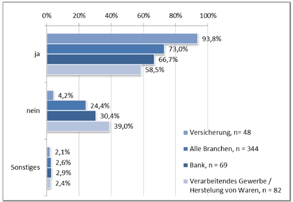 - Ein Viertel aller befragten Unternehmen berücksichtigen Reputationsrisiken derzeit nicht im Risikomanagement. Es liegen hier zum Teil deutliche Branchen-unterschiede vor: Bei Versicherungsunternehmen ist der Berücksichtigungsanteil bereits sehr hoch, bei Banken und dem verarbeitenden Gewerbe erfährt diese Risikoart wesentlich seltener Berücksichtigung.