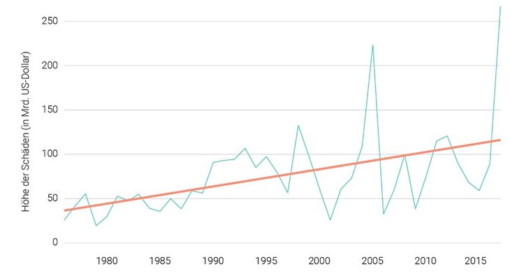 Im gleichen Zeitraum nahmen die Häufigkeit globaler, klimabedingter Katastrophen und die daraus resultierenden Schäden zu.