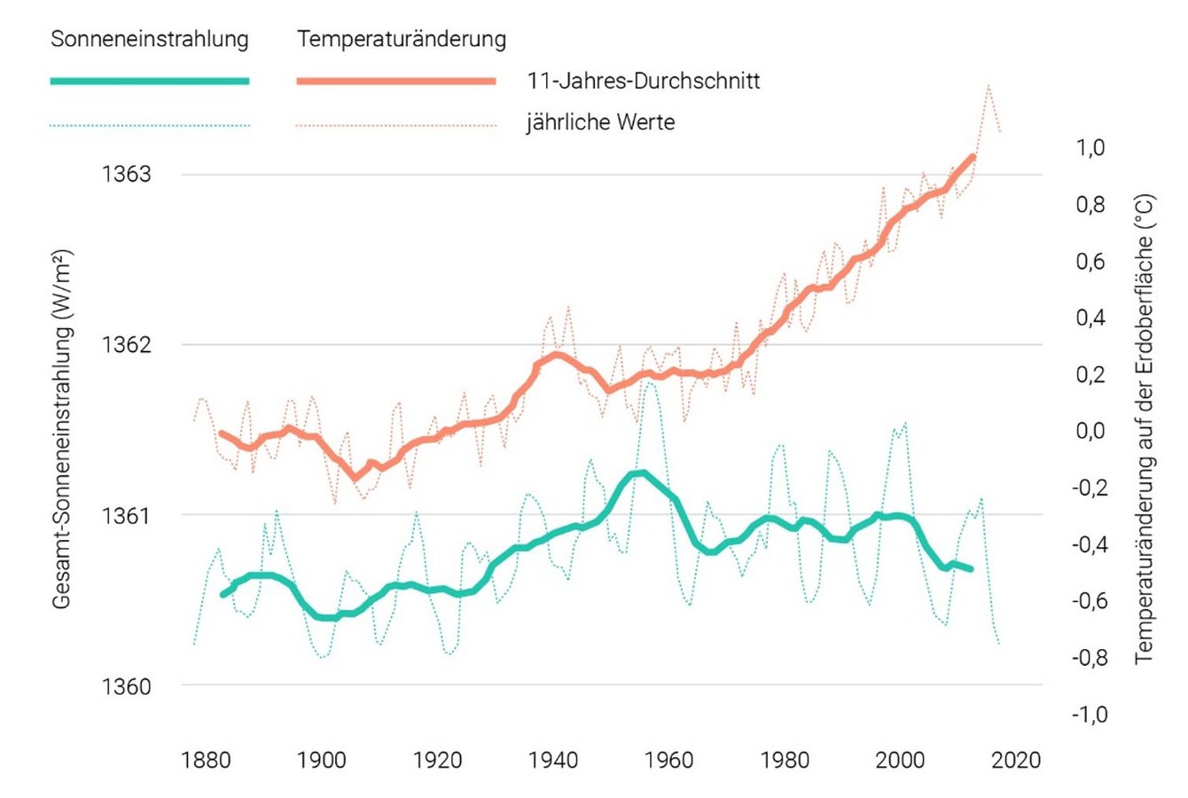 Ist die Sache wirklich noch eine Glaubensfrage? Oder gibt es handfeste Fakten? Bis Mitte des vergangenen Jahrhunderts könnte man den Temperaturanstieg noch leicht der zunehmenden Sonnenaktivität zuschreiben. Temperatur und Sonneneinstrahlung zeigten bis dahin einen Aufwärtstrend. Seitdem ist dies nicht mehr der Fall: Der Anstieg der Globaltemperatur hat sich weiter verstärkt, während die Sonneneinstrahlung nachgelassen hat. Was sich seit Mitte des letzten Jahrhunderts aber geändert hat, ist, dass das CO2-Level in der Atmosphäre ein höheres Niveau erreicht hat als in den 800.000 Jahren zuvor. Schwankte das Level früher stets zwischen 170 und 300 parts per million (ppm), so schoss es danach auf über 400 und liegt aktuell bei 412 ppm – Tendenz weiter steigend.