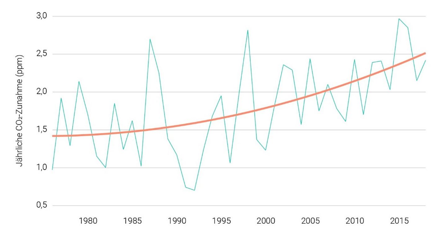 Abb. 04: Jährliche Zunahme des globalen Kohlendioxidgehalts in der Atmosphäre, 1976 – 2018 [Quelle: US National Oceanic & Atmospheric Administration, eigene Berechnung]