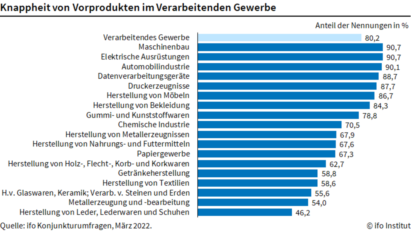 In den Schlüsselbranchen der deutschen Industrie sind die Anteile auf sehr hohem Niveau nahezu unverändert geblieben. So berichteten rund 90 Prozent der Unternehmen aus der Automobilindustrie, dem Maschinenbau und der Elektroindustrie von Lieferproblemen. In der Chemischen Industrie stieg der Anteil von 58,4 auf 70,5 Prozent. Auch bei den Herstellern von Bekleidung berichteten deutlich mehr Unternehmen von Knappheiten. "Ursprünglich hatten die Unternehmen für den Sommer mit einer Entspannung gerechnet. Die wird sich nun weiter verzögern", ergänzt Wohlrabe.