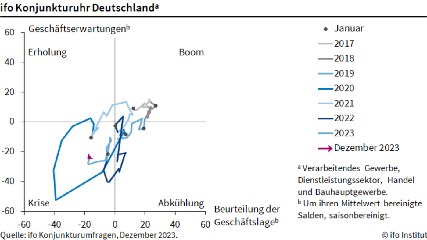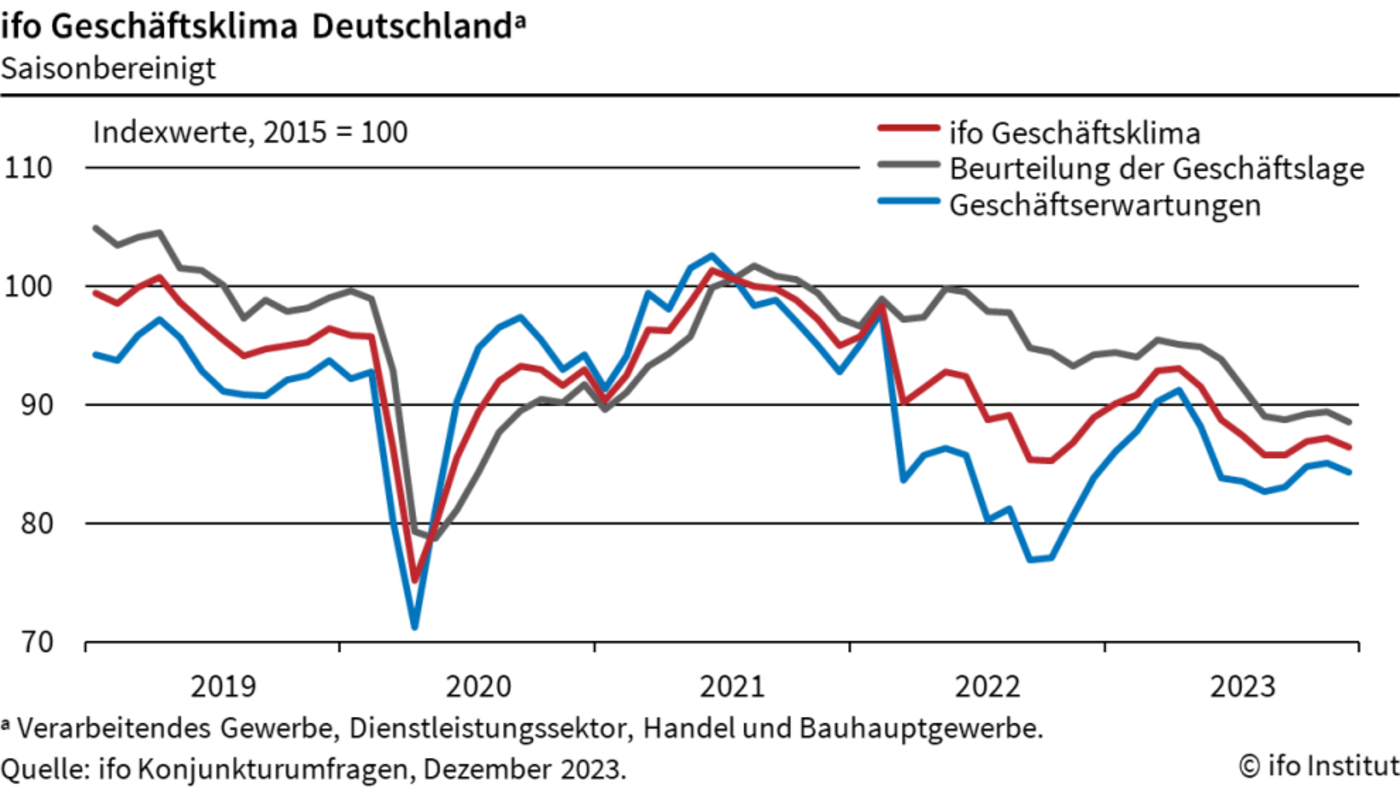 Die Stimmung unter den Unternehmen hat sich eingetrübt. Der ifo Geschäftsklimaindex ist im Dezember auf 86,4 Punkte gefallen, nach 87,2 Punkten (saisonbereinigt korrigiert) im November. Die Unternehmen waren weniger zufrieden mit den laufenden Geschäften. Zudem blickten sie skeptischer auf das erste Halbjahr 2024. Die Konjunktur bleibt auch in der Weihnachtszeit schwach.