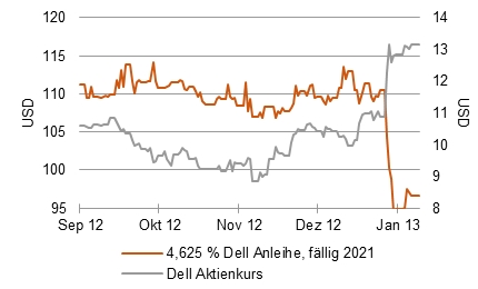 Abbildung 3: Dell-Aktien legen zu, Anleihen verlieren [Quelle: Bloomberg, eigene Darstellung]