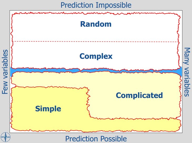 - Kompliziert sind verschachtelte kausale Zusammenhänge mit vielen Variablen, die wir ungenügend verstehen aber vorhersagbar sind.