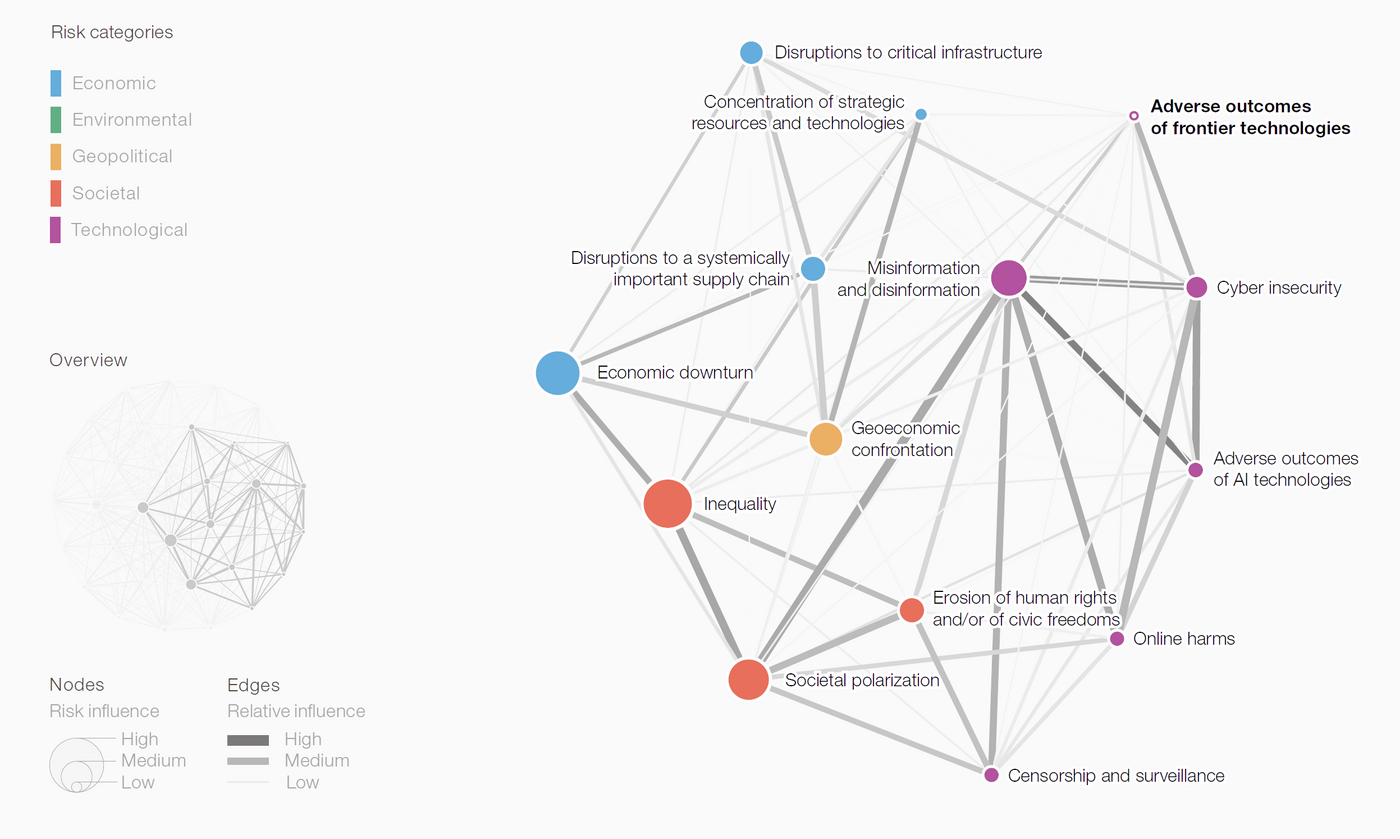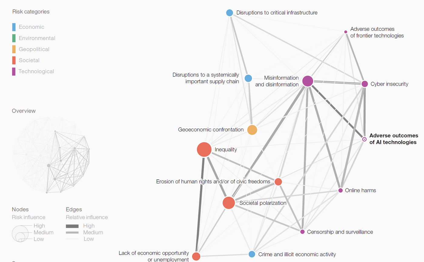 Im Kapitel "AI at large" analysiert der Global Risks Report die langfristigen Effekte einer umfassenden AI-Durchdringung von Wirtschaft, Verwaltung und Militär. Neben Produktivitätsgewinnen werden Risiken für Arbeitsmärkte, Qualifikationsprofile und Einkommensverteilung hervorgehoben. Die adversen Wirkungen von AI-Technologien sind in Abb. 04 skizziert.