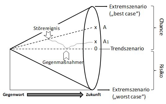 Die Szenariotechnik verfolgt etwa die Analyse von Extremszenarios (positives Extrem-Szenario/"Best Case Szenario", negatives Extrem-Szenario/"Worst Case Szenario") oder besonders relevanter oder typischer Szenarios (Trendszenario). Szenarios werden häufig in Form eines Szenariotrichters dargestellt (vgl. Abbildung). Bezogen auf die Zukunft symbolisiert der Trichter Komplexität und Unsicherheit. Die Zukunftsbilder befinden sich folglich auf der Schnittstelle des Trichters, wohingegen die Gegenwart immer am engsten Punkt des Trichters liegt. Den Ausgangspunkt der Betrachtung bildet das Trendszenario, welches auf einer Zeitachse aufgespannt wird. Dieses Trendszenario stellt die zukünftige Entwicklung unter der Annahme stabiler Umweltentwicklungen dar (ceteris paribus). Jenes Extremszenario, das die bestmögliche Entwicklung ("best case") aufzeigt, stellt das obere Ende des Trichters dar, wohingegen der sogenannte "worst case", also die schlechteste Entwicklungsmöglichkeit, das untere Ende bildet.