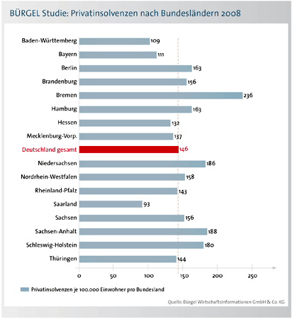 Bei den Privatinsolvenzen zeigen sich nach einer Analyse der Wirtschaftsauskunftei Bürgel für das Jahr 2008 große regionale sowie alters- und geschlechtsspezifische Unterschiede in Deutschland. Trotz des zeitweisen Rückgangs der Überschuldung von Verbrauchern erwartet Bürgel für 2009 eine deutliche Zunahme privater Pleiten. Insgesamt meldeten im vergangenen Jahr 120.289 Bundesbürger Verbraucherinsolvenz an, das sind 146 je 100.000 Einwohner. Im Vergleich zum Vorjahr bedeutet das einen Rückgang um 12,2 Prozent. Allerdings fällt die Zahl der Privatinsolvenzen je nach Bundesland sehr unterschiedlich aus: Spitzenreiter ist Bremen mit 236 Pleiten auf 100.000 Einwohner. Am seltensten nahmen die Saarländer das Insolvenzgericht in Anspruch (93 je 100.000 Einwohner), gefolgt von Baden-Württemberg mit 109 und Bayern mit 111 Verbraucherinsolvenzen je 100.000 Einwohner. Dies ist ein Ergebnis der aktuellen Studie "Schuldenbarometer 2008" der Bürgel Wirtschaftsinformationen GmbH& Co. KG aus Hamburg.
