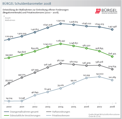 Doch dieser Schritt kommt nicht über Nacht. Frühindikatoren für Verbraucherinsolvenzen sind vor allem die eidesstattliche Versicherung und die Haftanordnung. Beantragt ein privater Schuldner die Insolvenz, hat er in der Regel mindestens eine dieser Maßnahmen schon durchlaufen. Auch die Frühindikatoren für eine drohende Privatinsolvenz waren auf Gesamtjahressicht 2008 rückläufig. So ging die Häufigkeit der eidesstattlichen Versicherung von 958.895 auf 826.475 zurück (minus 13,9 Prozent) und die Zahl der Haftanordnungen verringerte sich von 538.308 auf 504.674. Dies entspricht einem Minus von 6 Prozent. Für 2009 ist nach der Einschätzung von Bürgel hingegen ein Anstieg dieser Frühindikatoren zu erwarten.