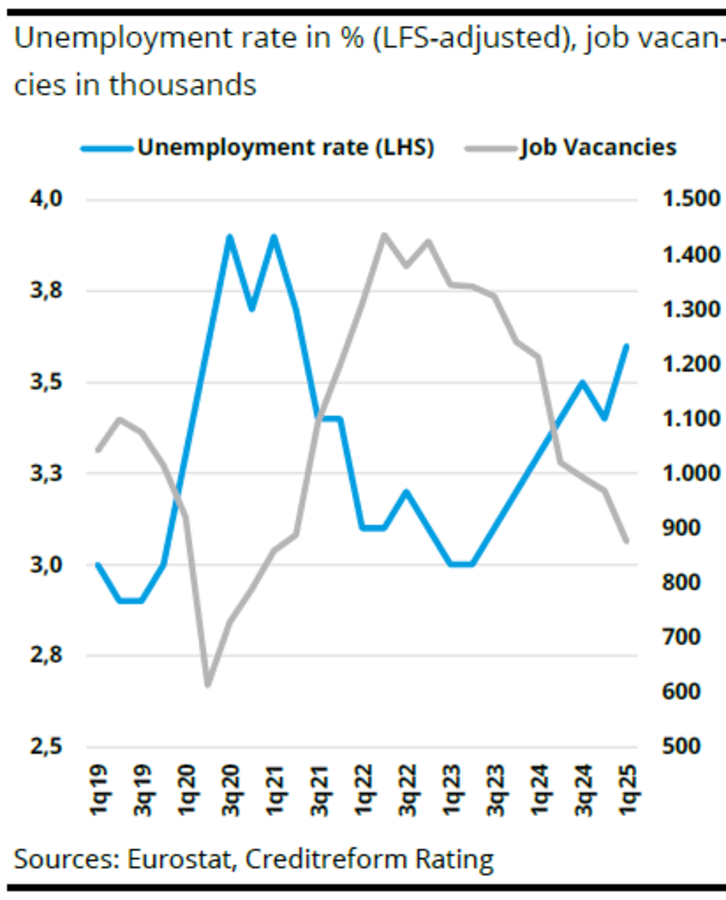 Abb. 01: Arbeitslosenquote und gemeldete Stellenangebote in Deutschland (2019–2025) [Quelle: Eurostat, Creditreform Rating]