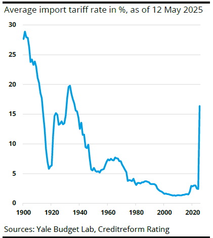 Abb. 02: Durchschnittlicher US-Einfuhrzollsatz seit 1900 [Quelle: Yale Budget Lab, Creditreform Rating]