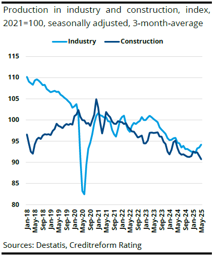 Der Index für die industrielle Produktion liegt im Mai 2025 bei nur noch 91 Punkten. Das ist der tiefste Wert seit 2018. Der Rückgang ist kein rein konjunkturelles Phänomen, sondern Ausdruck eines langfristigen Abbaus von Wettbewerbsfähigkeit. Die deutsche Industrie leidet unter hohen Energiepreisen, Fachkräftemangel, langsamen Genehmigungsprozessen und der Abwanderung forschungsintensiver Produktion. Besonders betroffen sind energieintensive Sektoren wie Chemie, Metallerzeugung und Maschinenbau.