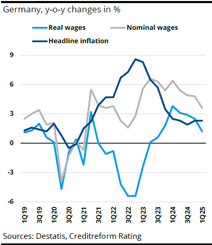 Trotzdem ist von einer massiven Entlassungswelle keine Rede. Die Kurzarbeit bleibt ein wirksames Instrument zur Arbeitsplatzsicherung, und die stabile Entwicklung im Dienstleistungssektor federt die Probleme in der Industrie teilweise ab. Gleichzeitig verläuft die Entwicklung der Reallöhne ambivalent. Zwar steigen die nominalen Einkommen moderat, doch inflationsbereinigt bleibt die Kaufkraft auf Vorkrisenniveau. Immerhin: Die Tarifergebnisse im ersten Halbjahr 2025 dürften angesichts der abklingenden Inflation Spielraum für Reallohnzuwächse schaffen.