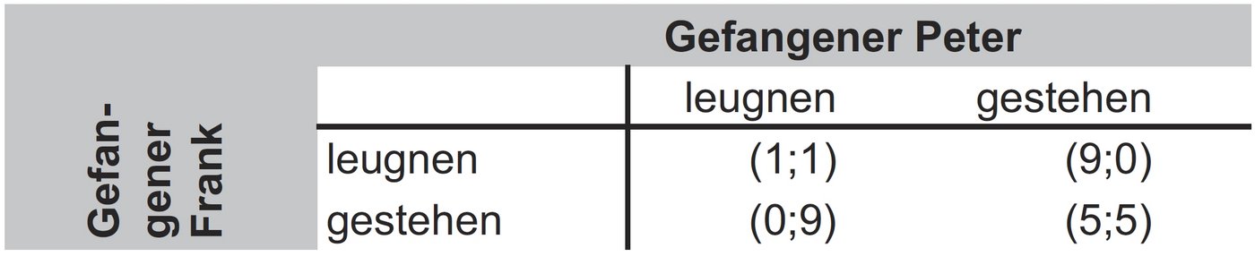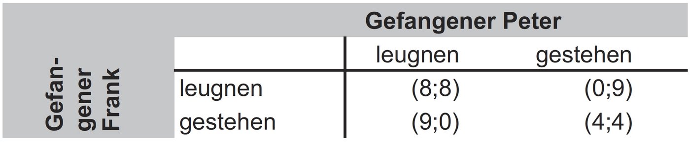 Die Matrix bedeutet: Wenn Peter und Frank leugnen, bekommen sie jeweils ein Jahr Haft. Wenn Peter gesteht und Frank leugnet, bekommt Frank neun Jahre Haft und Peter geht straffrei aus. Wenn beide gestehen, erhalten sie jeweils fünf Jahre Haft. Die Maximalstrafe beträgt für jeden Einzelnen neun Jahre Haft und die persönliche Nutzenmaximierung besteht nun in der Reduzierung der maximalen Haftzeit. Dazu wird die Matrix überführt in eine Darstellung der verkürzbaren Haftzeit in Jahren (= Maximalstrafe – Hafterleichterung durch Gestehen bzw. beidseitiges Leugnen).