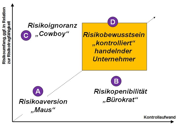 Eine "Maus" (A) geht ein geringes Risiko ein und hat einen äußerst geringen Kontrollaufwand. Der "Bürokrat" (C) hingegen ist ähnlich risikoscheu, nimmt aber durch seine Kontrollstruktur in Kauf, dass auch seine Chancen – und damit sein Wachstums- und Entwicklungspotenzial – äußerst begrenzt sind. Ein "Cowboy" (C) hingegen riskiert die Gefahr, von negativen Entwicklungen überrascht zu werden, die er nicht mehr kontrollieren kann. Der "kontrolliert handelnde Unternehmer" (D) demgegenüber verwendet bei seinen Entscheidungen die Werkzeuge des Risikomanagements und geht Risiken bewusst und kontrolliert ein, um die damit verbundenen Gewinnchancen zu realisieren.