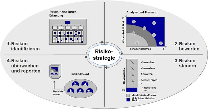 Der Risk-Management-Prozess gliedert sich in die folgenden Stufen: Risikoanalyse, Prüfen der Handlungsalternativen (vermeiden, vermindern, begrenzen, selbst tragen, externalisieren), Gestaltung der Risikopolitik sowie Durchführung und Kontrolle.