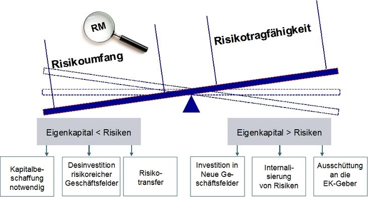 Sollte der vorhandene Risikoumfang eines Unternehmens gemessen an der Risikotragfähigkeit zu hoch sein, werden zusätzliche Maßnahmen der Risikobewältigung erforderlich.