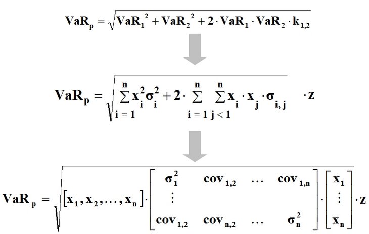und beträgt 59,31 mit 95-prozentiger Wahrscheinlichkeit auf einen Planungshorizont von einem Jahr. Gegenüber dem undiversifizierten Value at Risk der zu 82,25 addierten Einzelrisiken entspricht dieser Wert einer Reduktion von knapp 30 Prozent. Für den Fall von mehr als zwei Wertpapieren wird statt der oben gezeigten Formel mit einer Wurzel dann eine Matrizenmultiplikation verwendet (vgl. Abbildung unten). In den Matrizen stehen die Varianzen und statt der Korrelationen die Kovarianzen der Risikofaktoren woraus der Name des für beliebig viele Risikofaktoren gültigen Modells resultiert: Varianz-Kovarianz-Modell [vgl. Romeike/Hager 2013, S. 313 ff].